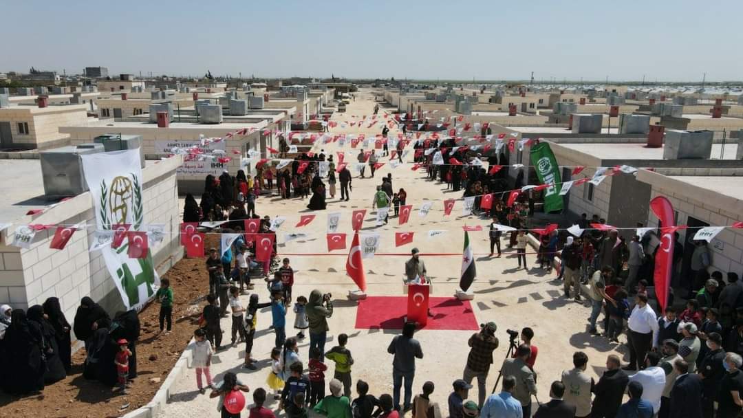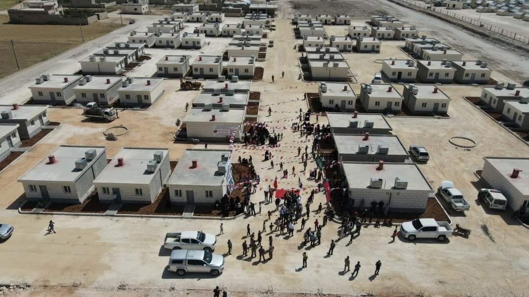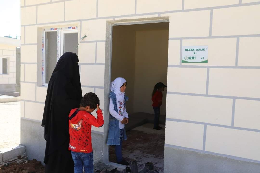 Suriye Dünya Yetimler Günü'nde, Suriye’nin Azez’e bağlı İhtimlat kasabasında yetim aileler için yapımı tamamlanan 144 adet beton çatılı briket evin teslimi gerçekleştirildi.