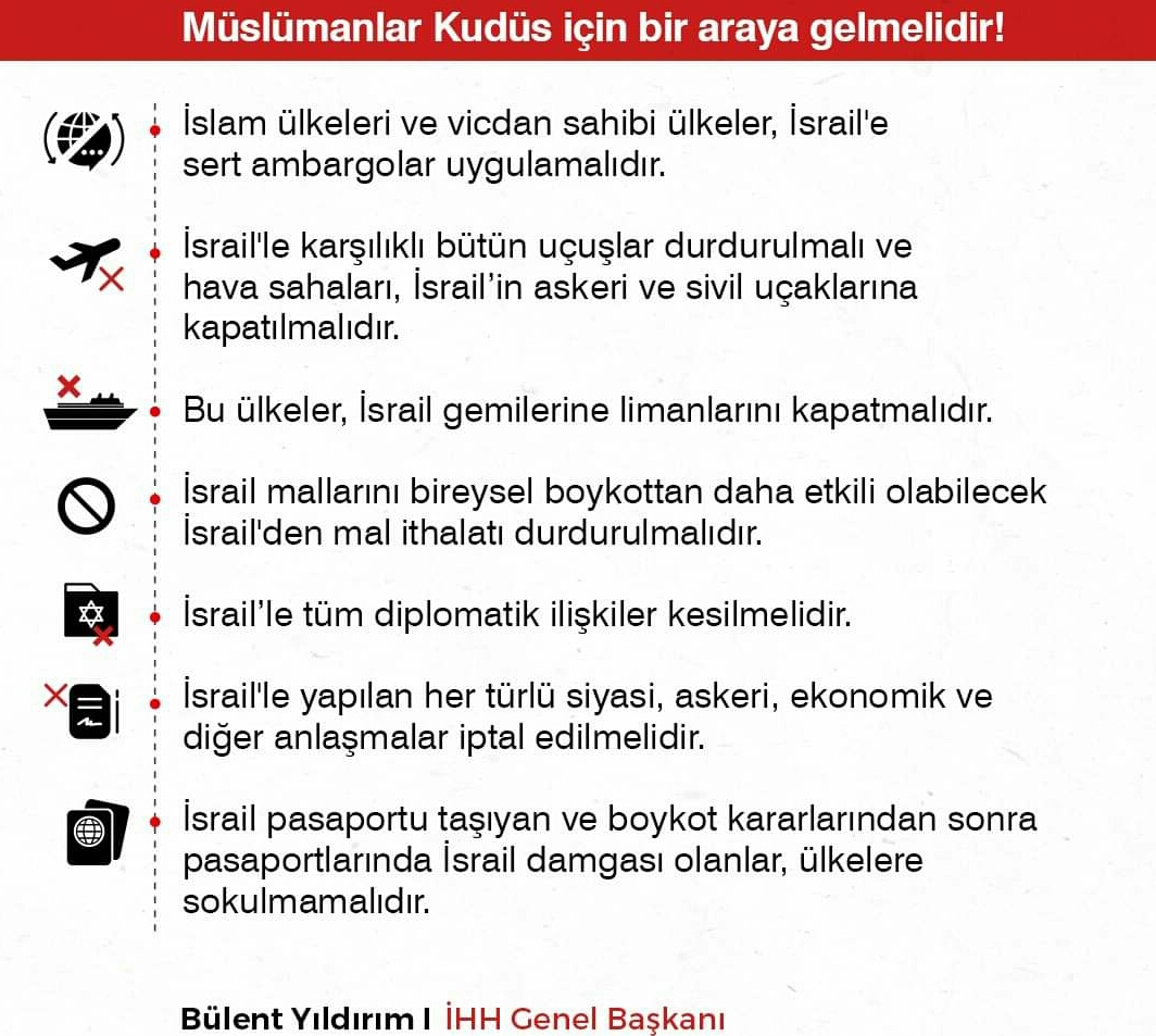 ◾️ İsrail'le yapılan her türlü siyasi, askeri, ekonomik ve diğer anlaşmalar iptal edilmelidir.