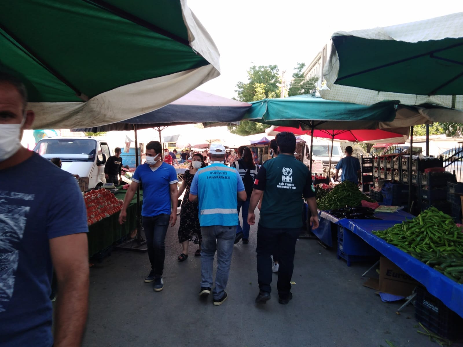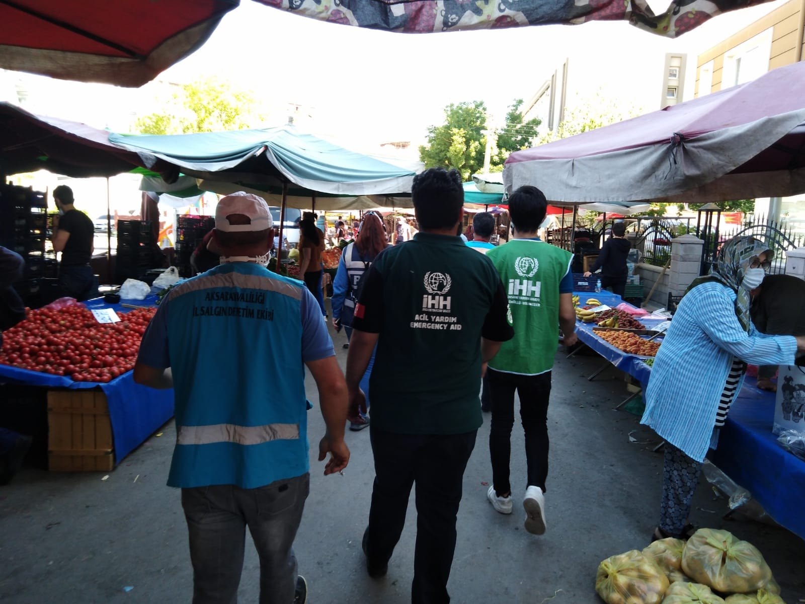 Bugün pazar yerlerinde uygulanan denetimler kapsamında; Aksaray Merkez'de bugün yapılan denetimlerde İHH Gönüllülerimiz tarafından özellikle vatandaşların maske takmaları ve sosyal mesafenin korunması konusunda uyarılarda bulundu.