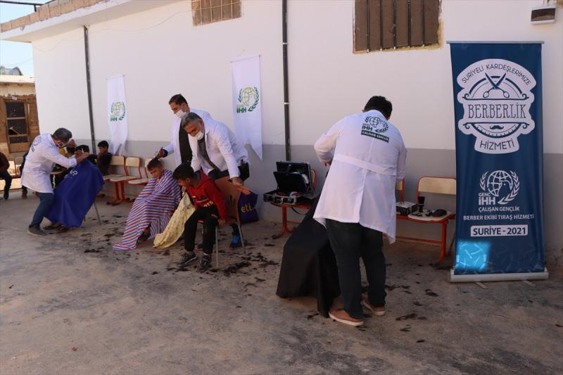 Suriye'nin İdlib kırsalında yaşayan 110 yetim çocuk, Türkiye'den gönüllü giden berberlerce tıraş edildi.