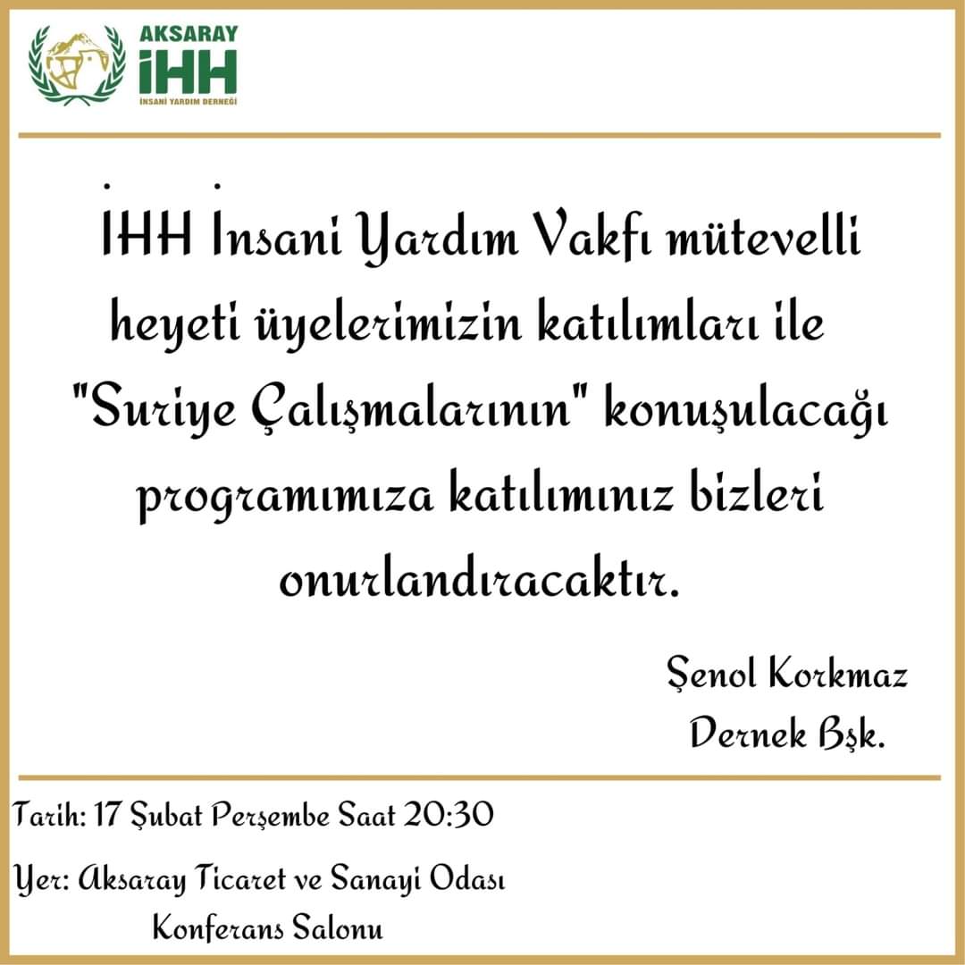 İHH İnsani Yardım Vakfı Mütevelli Heyeti Üyelerinin katılımları ile yapılacak olan "Suriye Çalışmalarının" konuşulacağı programımıza katılımınız bizleri onurlandıracaktır.