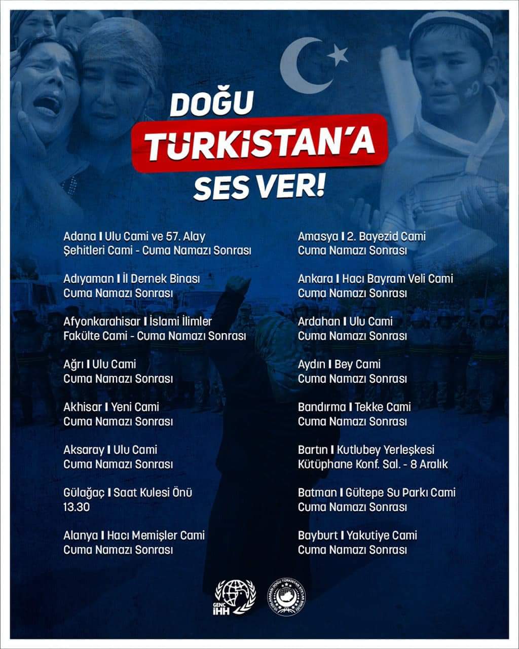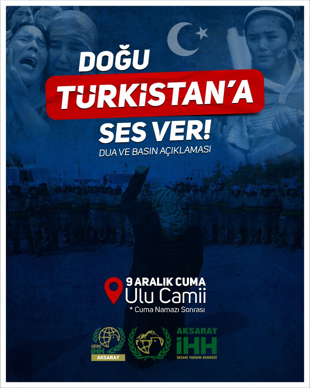 Çin zulmü altındaki Doğu Türkistanlı kardeşlerimizin sesi oluyoruz! Tüm Türkiye genelinde, Cuma namazı sonrası düzenleyeceğimiz dua ve basın açıklamalarına davetlisiniz.