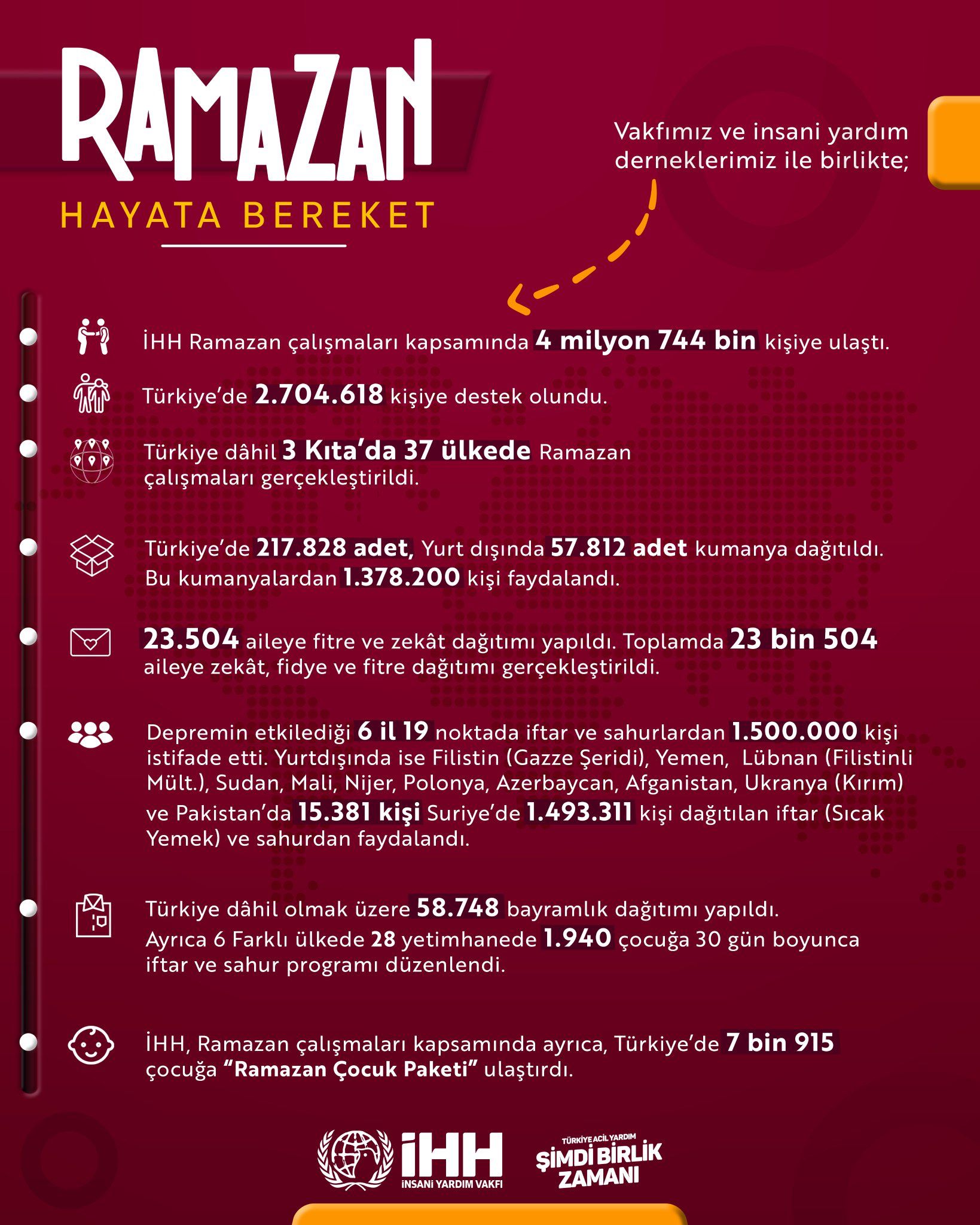 İHH İnsani Yardım Vakfı, “Ramazan Hayata Bereket” sloganıyla gerçekleştirdiği bu yılki Ramazan çalışmaları kapsamında, 4 milyon 744 bin kişiye yardım ulaştırdı. Çalışmalarını depremden etkilenen illerde yoğunlaştıran İHH ayrıca, savaş ve kriz yaşanan 36 ülkede de yardım faaliyetlerinde bulundu.