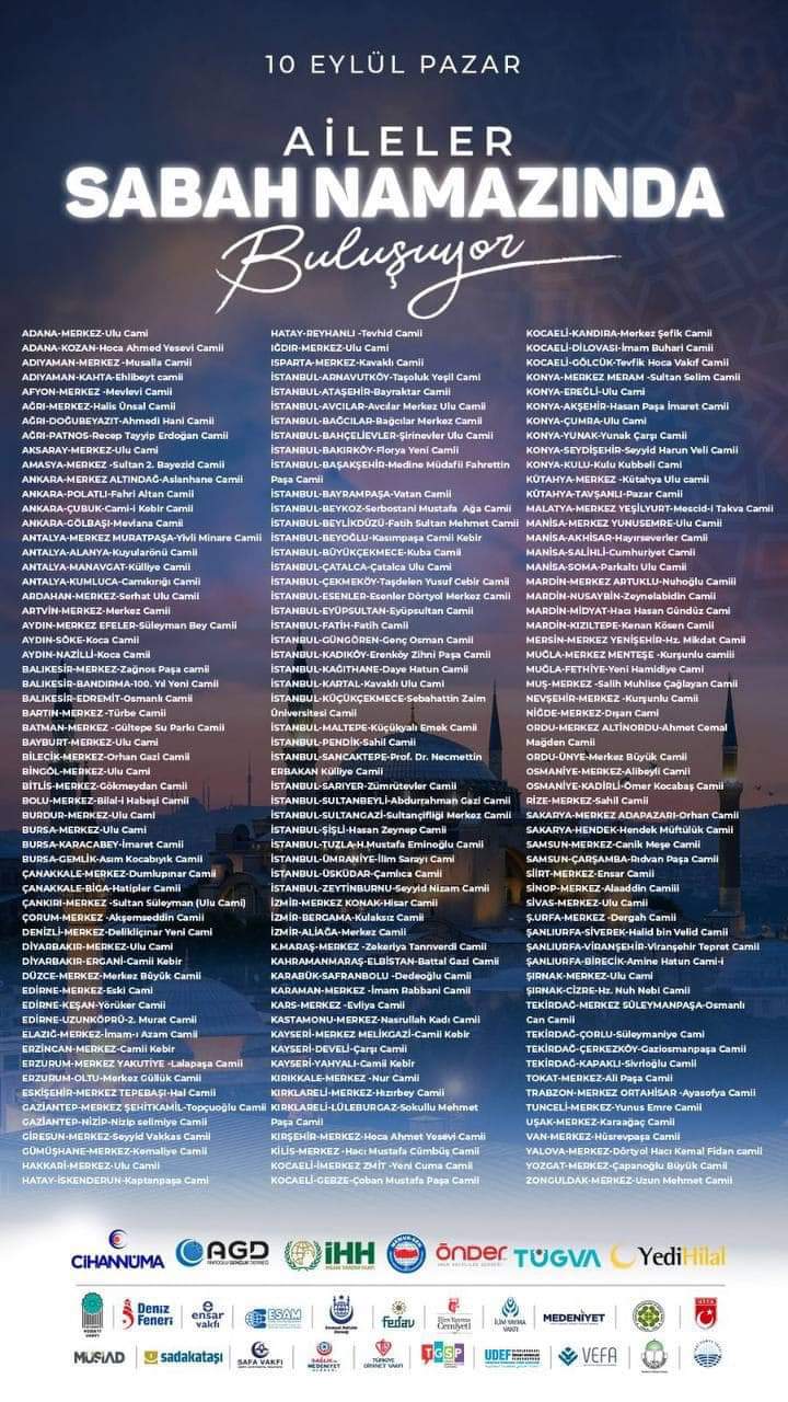 Türkiye’nin önde gelen Sivil Toplum Kuruluşları’nın birlikte düzenlediği “Gençler ve Aileler Sabah Namazında Buluşuyor” programı 10 Eylül Pazar günü tüm Türkiye’de gerçekleşecek.