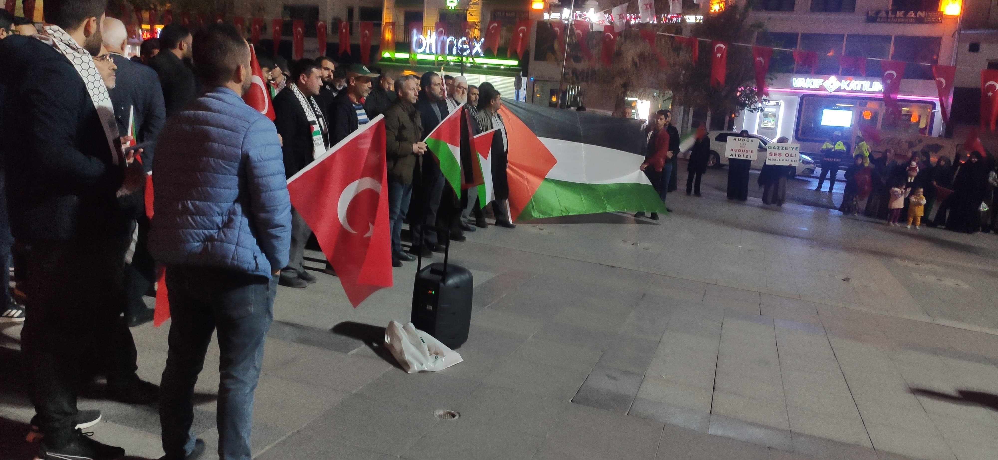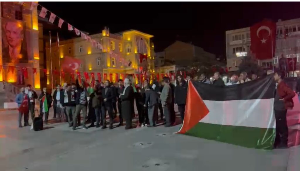 15 Temmuz Milli İrade Meydanı’nda bir araya gelen kalabalık, İsrail’in Filistin topraklarına yönelik saldırılarını kınayarak Filistin bayrağı açıldı.