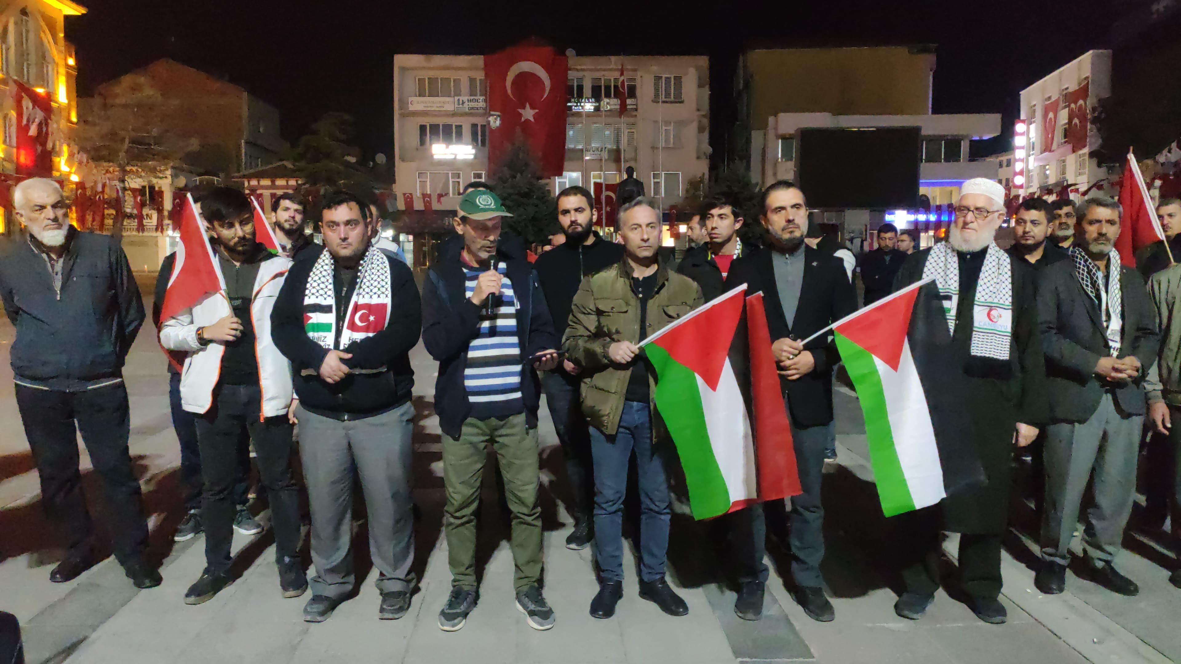 Protestoya katılanlar, tekbirler getirerek ve dualar ederek Filistinlilerin yanında olduklarını gösterdiler. Burada konuşma yapan İHH Başkanımız Şenol Kormaz; Dünya toplumunun bu olaya bu vahşete sessiz kalmaması gerektiğini ve uluslararası toplumun sorumluluk taşıdığını vurgulayarak bu katliam son bulsun dedi.