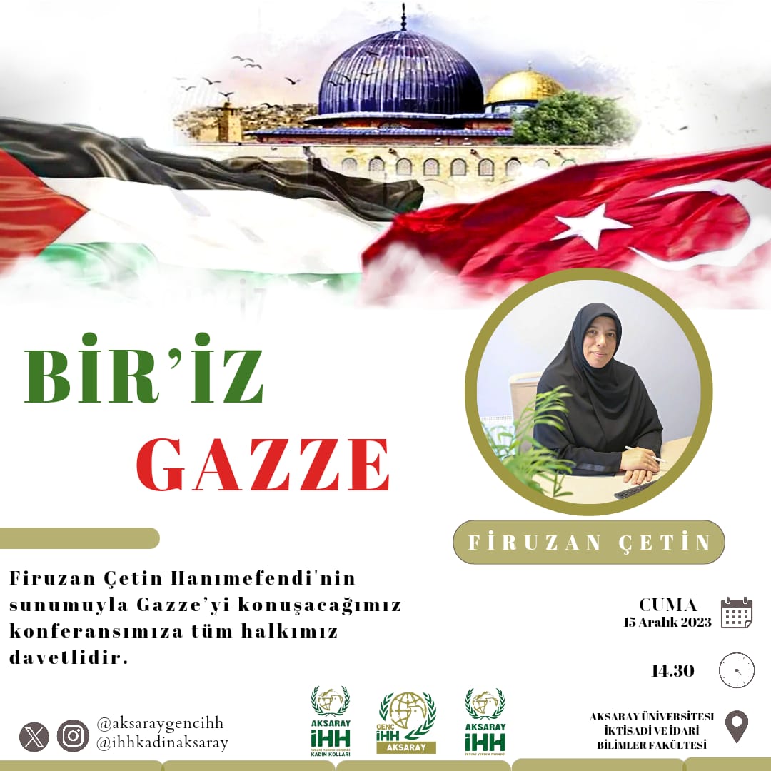 Aksaray Üniversitesinde gerçekleştireceğimiz Firuzan Çetin hanımefendinin konuşmacı olacağı "Bir'iz Gazze" konulu konferansımıza davetlisiniz.