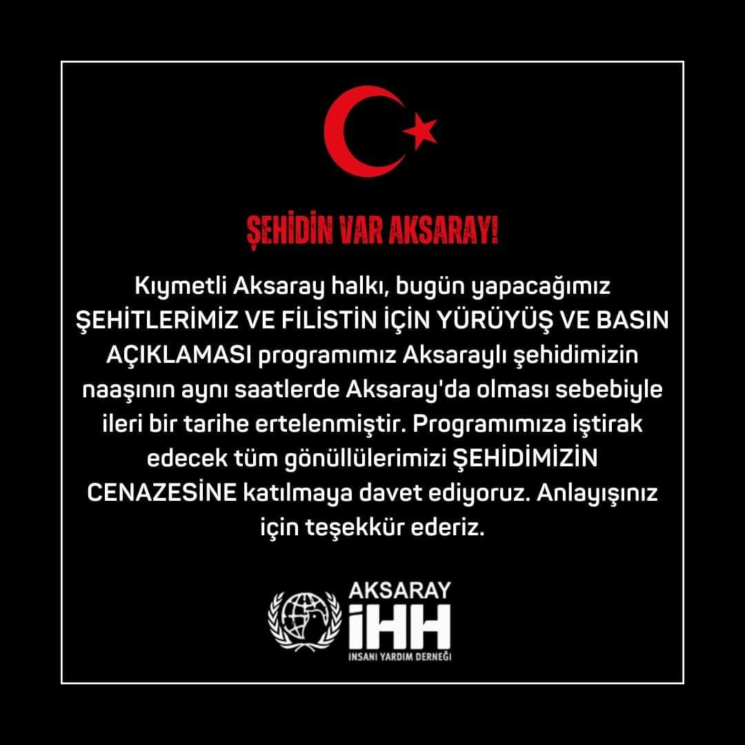 Bugün yapacağımız ŞEHİTLERİMİZ VE FİLİSTİN İÇİN YÜRÜYÜŞ VE BASIN AÇIKLAMASI programımız Aksaraylı şehidimizin naaşının aynı saatlerde Aksaray'da olması sebebiyle ileri bir tarihe ertelenmiştir.