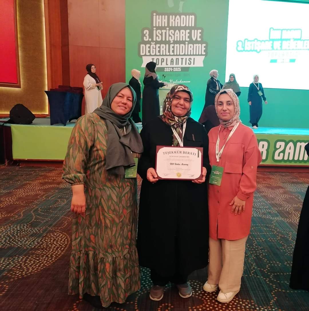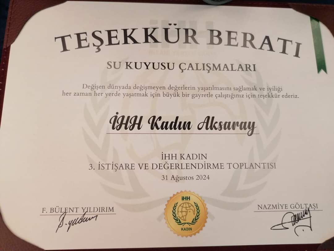 İHH Kadın 3. İstişare toplantısı yapıldı. Aksaray İHH Kadın Kollarımıza İHH Genel Merkez tarafından su kuyusu çalışmalarında gösterdikleri üstün gayret için "Teşekkür Beratı" verildi.