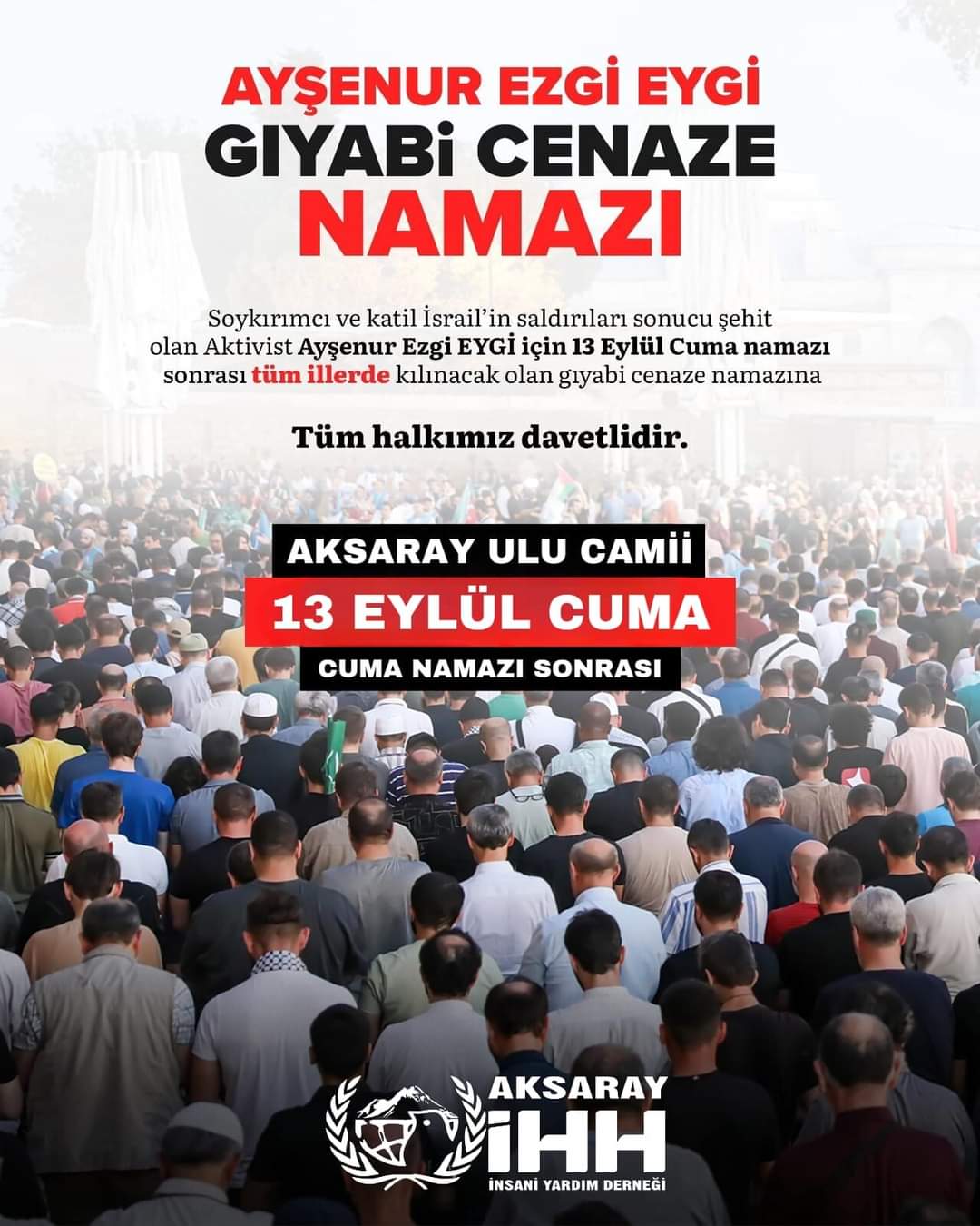Soykırımcı ve katil işgalci İsrail’in saldırıları sonucu şehit olan Ayşenur Ezgi EYGİ için 13 Eylül Cuma günü tüm illerimizde kılınacak gıyabi cenaze namazına tüm halkımız davetlidir.