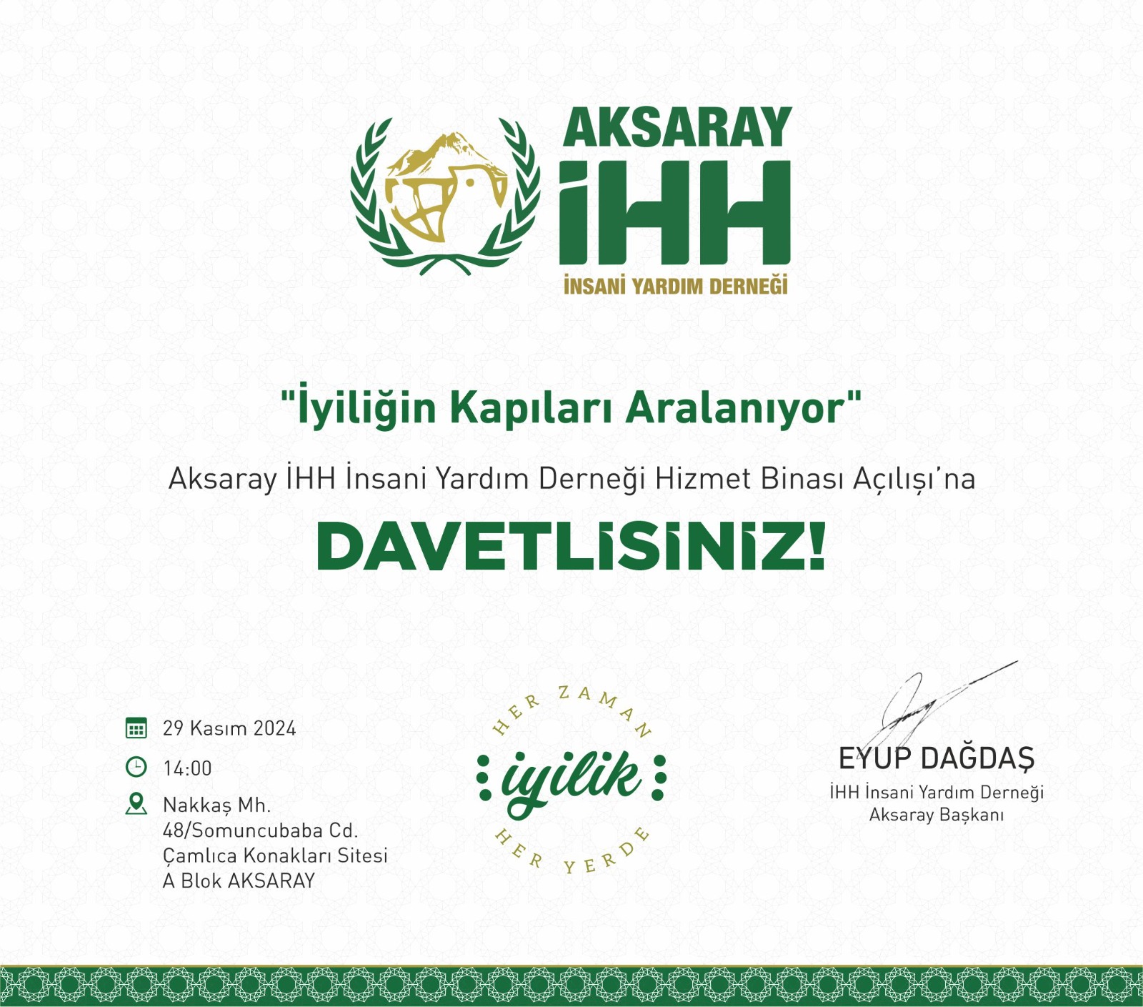Aksaray İHH İnsani Yardım Derneği Hizmet Binası Açılışına tüm halkımız davetlidir.