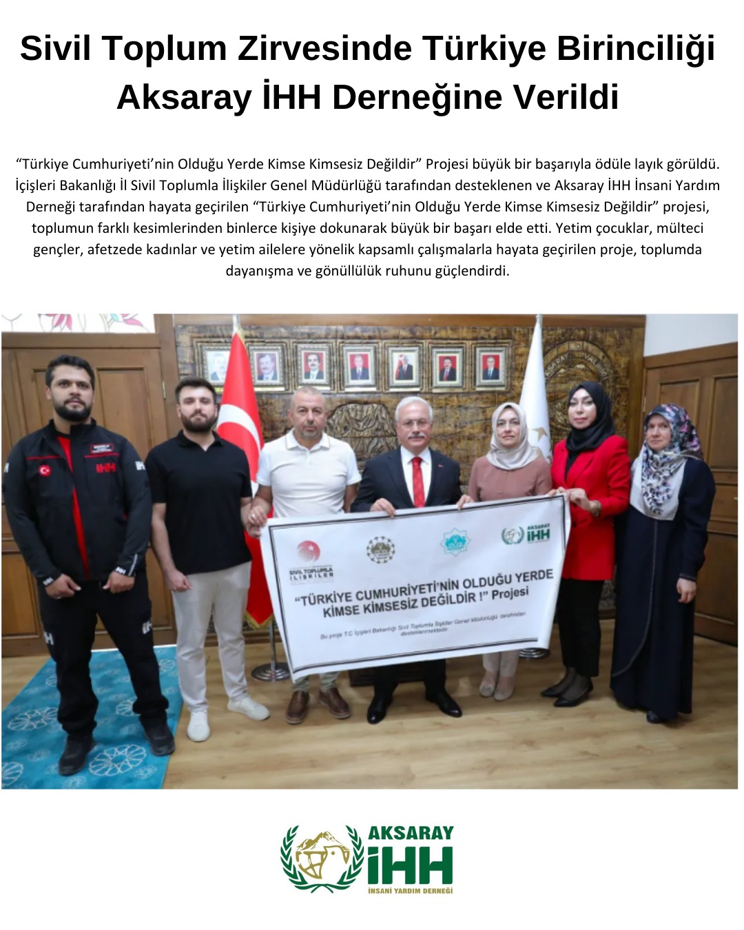 İçişleri Bakanlığı İl Sivil Toplumla İlişkiler Genel Müdürlüğü tarafından desteklenen ve Aksaray İHH İnsani Yardım Derneği tarafından hayata geçirilen “Türkiye Cumhuriyeti’nin Olduğu Yerde Kimse Kimsesiz Değildir” projesi, toplumun farklı kesimlerinden binlerce kişiye dokunarak büyük bir başarı elde etti. Yetim çocuklar, mülteci gençler, afetzede kadınlar ve yetim ailelere yönelik kapsamlı çalışmalarla hayata geçirilen proje, toplumda dayanışma ve gönüllülük ruhunu güçlendirdi.