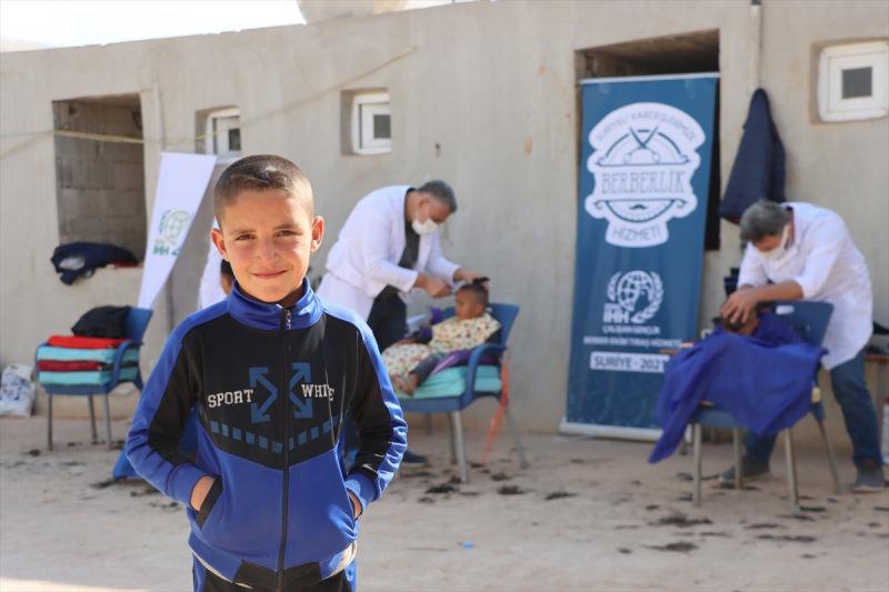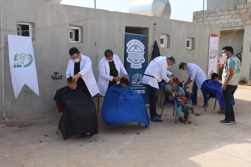 Suriye'nin İdlib kırsalında yaşayan 110 yetim çocuk, Türkiye'den gönüllü giden berberlerce tıraş edildi.