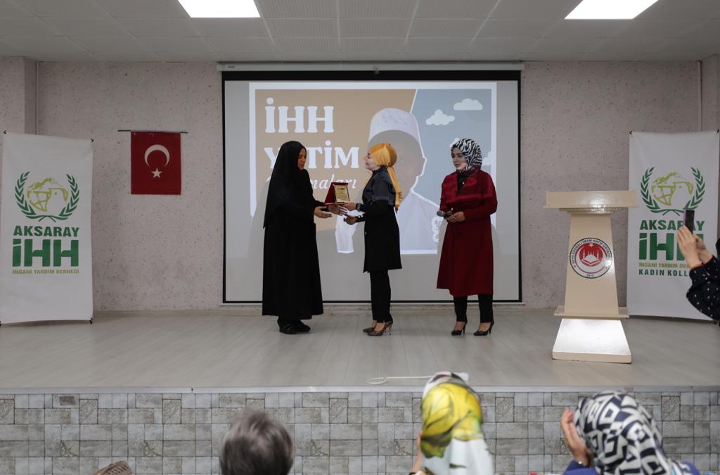 Programın sonunda Aksaray Valisi Mehmet Ali Kumbuzoğlu’nun eşi Canan Kumbuzoğlu tarafından konuşmacı İHH Yetim Koordinatörü Hatice Cevher’e teşekkür plaketi takdim edildi.